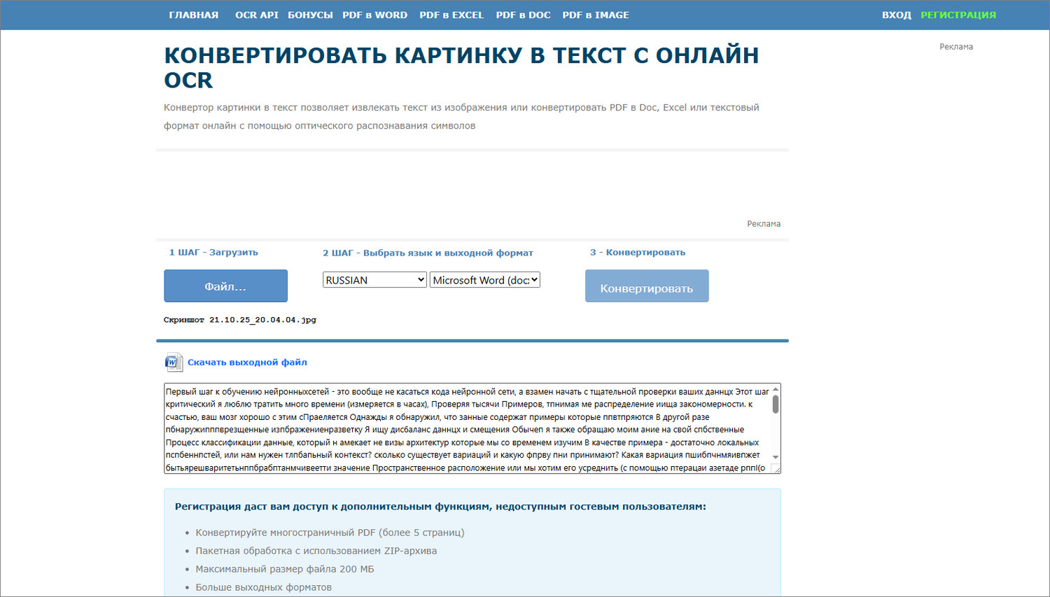 Онлайн конвертер изображений в текст доступен бесплатно без регистрации, но после авторизации функционал расширяется. Вы сможете работать с ПДФ-документами до 5 страниц или загружать для преобразования ZIP-архивы объемом до 200 МБ. Также увеличивается число выходных форматов (в базовой версии — только TXT, DOC и XLS).
