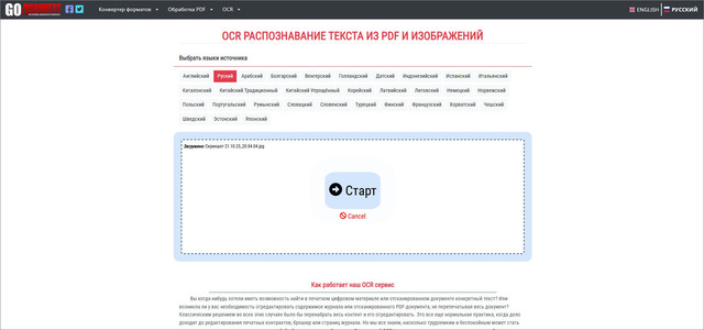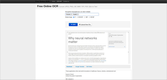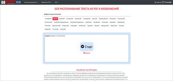 Еще одно решение, как на компьютере скопировать текст с фото без установки софта. Онлайн-распознаватель понимает 50+ языков, позволяет работать с многоколоночными макетами. А если вы распознали иностранный текст, программа быстро перенаправит вас в онлайн-переводчик. Также можно проверить и исправить недочеты прямо в браузере. Пожалуй, единственный минус — файлы грузятся и преобразование выполняется очень долго, а при медленном сигнале возможны вылеты.