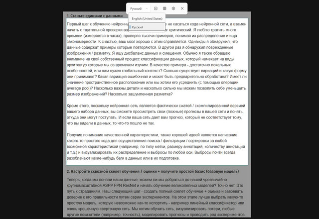 - Выберите нужный язык, выделите рамкой область захвата, и скопируйте текст — он будет доступен в буфере.