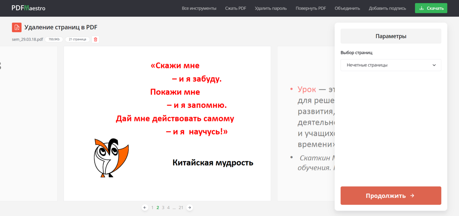 Если нужно быстро конвертировать проект в PDF, дополнительно сжать его, удалить лишние страницы, добавить водяной знак или защитить паролем, можно воспользоваться российским онлайн-сервисом PDF Maestro https://pdf-maestro.ru/. Он доступен в браузере и предлагает более 20 инструментов. Выберите подходящий и приступайте к работе без регистрации.