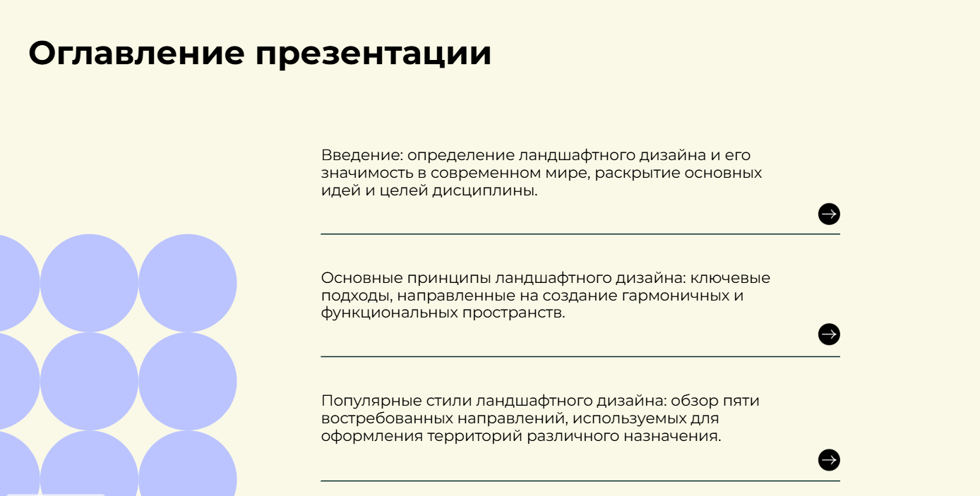 3. Содержание. Отражает структуру выступления: основные разделы и подразделы. Особенно полезно для длинных выступлений, чтобы кратко ввести слушателя в курс дела.