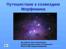 1. - А теперь мы отправляемся в новое путешествие – космическое. Мы летим к созвездию Морфемика. Это новые для вас планеты. Но мы не можем сказать, что ничего не знаем об этом созвездии. Что такое морфемика? (Слайд №1)
