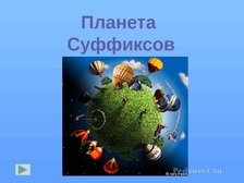 4. - Порядок восстановлен. Мы можем отправляться на планету Суффиксальную. Какая же она пёстрая! Какое разнообразие суффиксов! Их около пятисот проживает на этой планете.(Слайд №11)