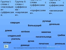 -Распределите слова на четыре группы по значениям суффикса.(Слайд №12)