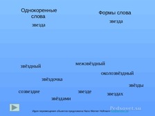 Звезда, звёздочка, звёздный, межзвёздный, околозвёздный, созвездие, звёзды, звёздами, звезде, звездах.(Слайд №6)