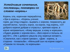 - Мы очень часто употребляем слово «корень» в своей речи, говоря о чём-то важном, главном. Давайте вспомним устойчивые словосочетания, пословицы, поговорки со словом «корень».(Слайд №7)