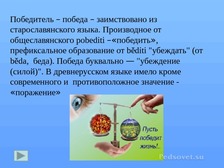 ( победитель – победа – заимствовано из старославянского языка. Производное от общеславянского pobediti –«победить», префиксальное образование от běditi "убеждать" (от běda, см. беда). Победа буквально — "убеждение (силой)". В др.-рус. яз. имело кроме соврем. и противоположное значение «поражение» (Слайд №8)