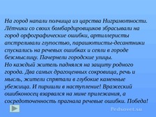 На город напали полчища из царства Ниграмотности. Лётчики со своих бомбардировщиков збрасывали на город орфографические ошибки, артиллеристы апстреливали глупостью, парашютисты-десантники спускались на речевых ошибках и сеяли в городе безсмыслицу. Пачернели городские улицы.