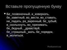 Бе_позвоночный, и_коверкать, бе_заветный, во_вести, во_ставать, ни_падать, ра_варенный, бе_зубый, в_сколыхнуть, во_принимать, бе_бедный, _дравствуй, бе_страшный,_жать, бе_порядок, в_молиться.