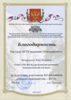 Благодарность за подготовку участников XIII Фестиваля "Неделя информатики - 2012"