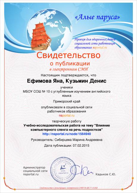 Ребята из 9 класса участвовали в городской конференции учебно-исследовательских работ. Они выбрали тему ""Сленг в речи подростков", из-за ее актуальности. И, хотя заняли только 4 место в городе, работа получилась, на мой взгляд, хорошая.